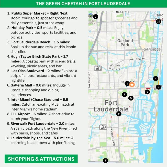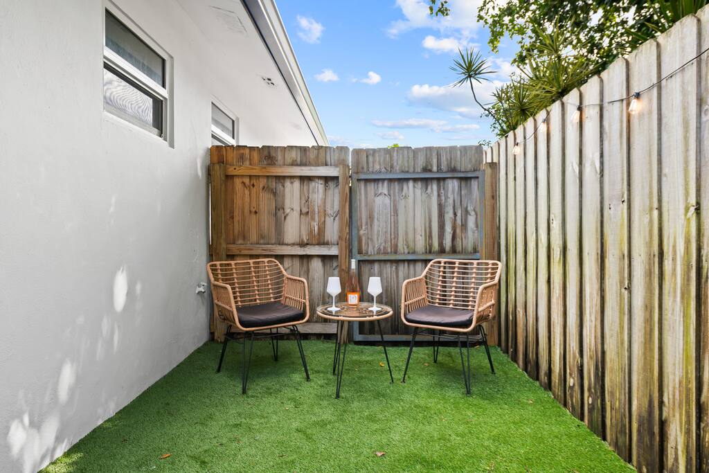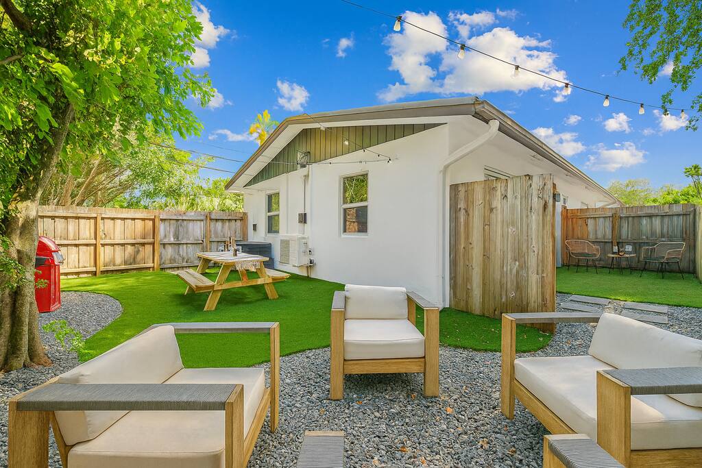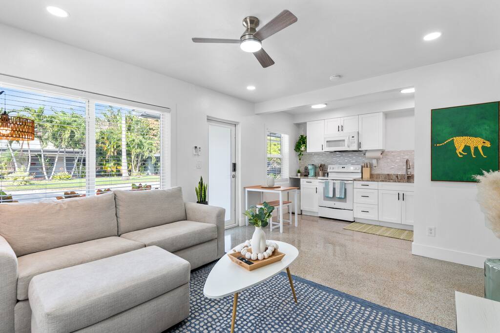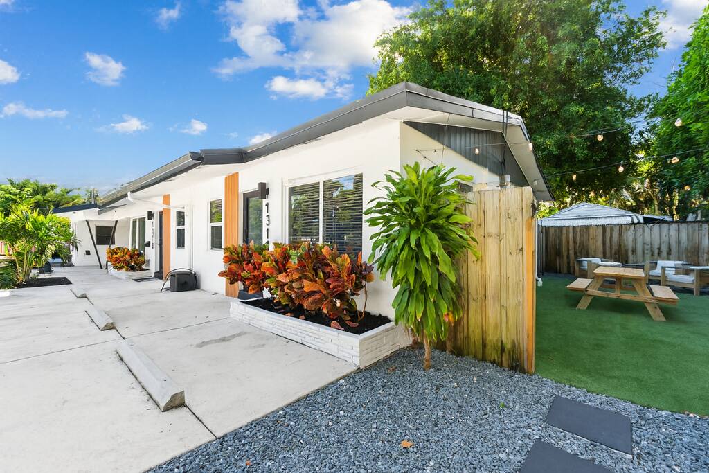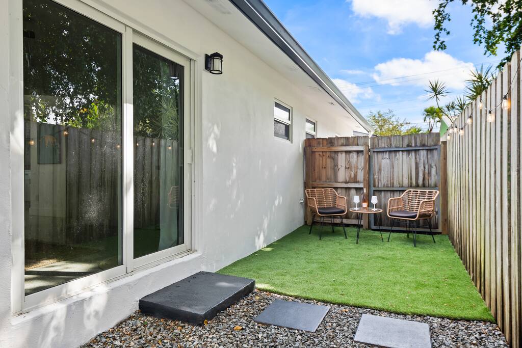 Welcome to The Green Cheetah — a modern 1BR private guest suite with hotel-quality finishes and a huge fully-private turf yard designed for sunshine, grilling, and relaxing under the string lights. Located in one of Fort Lauderdale’s most convenient and walkable neighborhoods — Publix and Walgreens are right next door, and you're 5 minutes from the beach and Las Olas. ⭐ Modern 1BR / 1BA private guest suite ⭐ Massive private turf yard + outdoor lounge ⭐ 5 minutes to Fort Lauderdale Beach + Las Olas ⭐ Walkable — Publix + restaurants steps away ⭐ Private driveway parking for 2 cars Backyard & Outdoor Living ✸ Huge fenced turf yard — rare for a 1BR stay ✸ Lounge seating + dining table ✸ Grill & outdoor games (cornhole!) ✸ String lights + cozy evening vibe Inside the Home ✸ Bright living space with stylish décor ✸ Smart TV + comfortable sofa ✸ Fully stocked kitchen + dining space ✸ Hotel-quality linens, towels & pillows Bedroom ✸ Queen Nectar mattress (guests rave about the sleep!) ✸ Blackout curtains + ceiling fan ✸ Clean & modern design Work & Wi-Fi ✸ Fast, reliable high-speed Wi-Fi ✸ Perfect for remote workers or study trips Extras Guests Love ✸ Coffee station (coffee included) ✸ Keyless entry ✸ Great AC + 2 ceiling fans ✸ Pet-friendly on a case-by-case basis Location Highlights ✸ Beach – 5 minutes ✸ Las Olas – 8 minutes ✸ Publix & Walgreens – 1 minute walk ✸ Galleria Mall – 6 minutes ✸ Hugh Taylor Birch State Park – 5 minutes ✸ FLL Airport – 12 minutes We’re local Superhosts and thoughtfully designed this suite for comfort, privacy, and convenience. Guests love the peaceful stay, easy beach access, and the private yard that feels like your own mini-retreat. Professional cleaning, fast communication, and a space designed for relaxation — whether you're here for a beach getaway, solo trip, remote work stay, or a couple’s retreat. Welcome to The Green Cheetah — your private Fort Lauderdale escape.