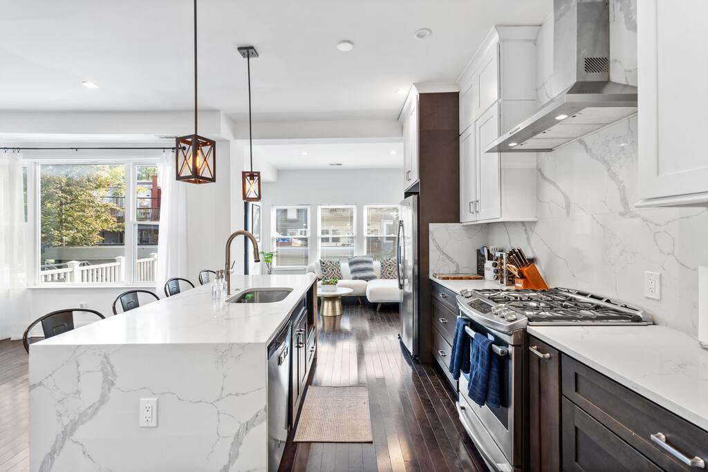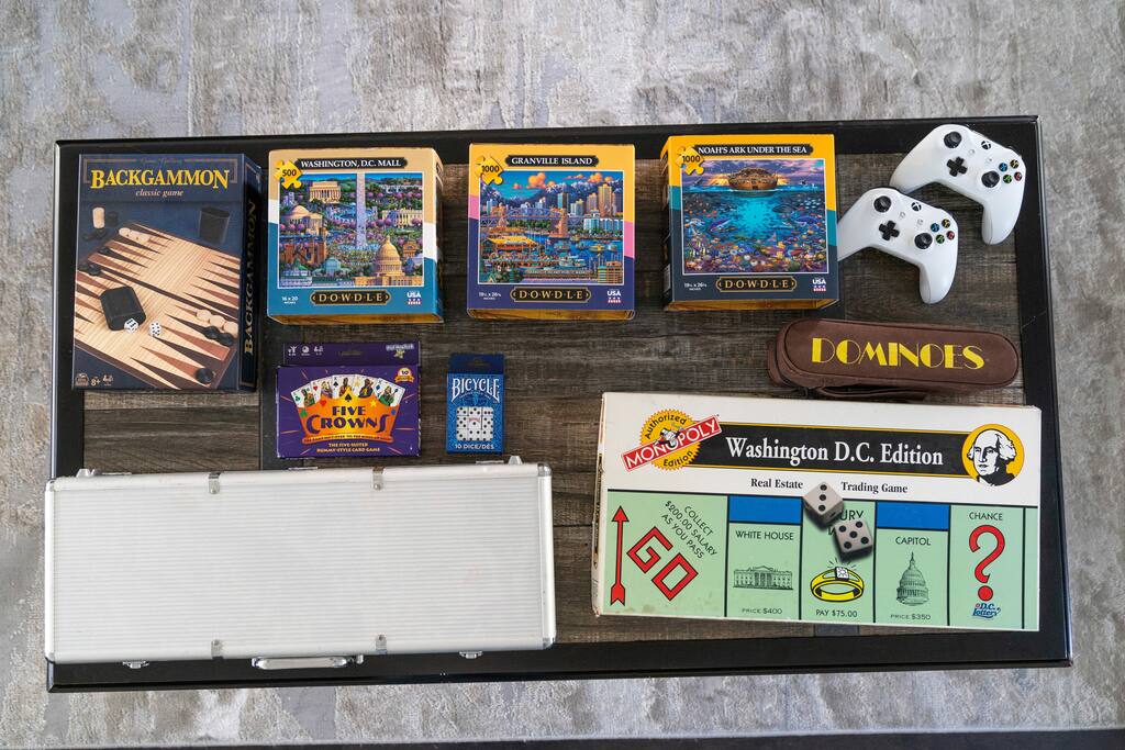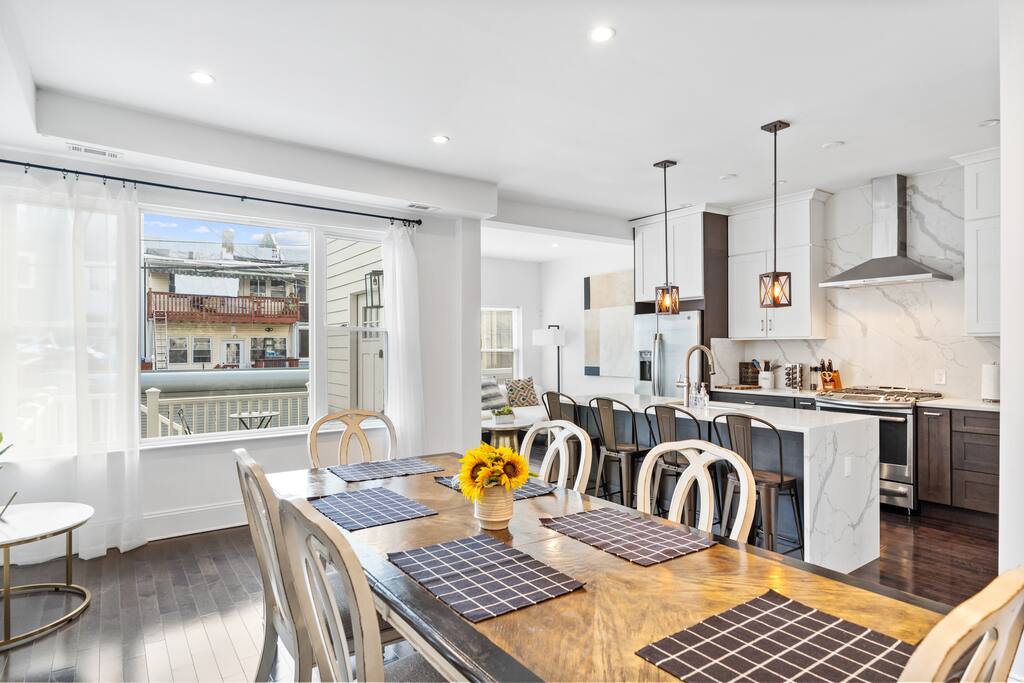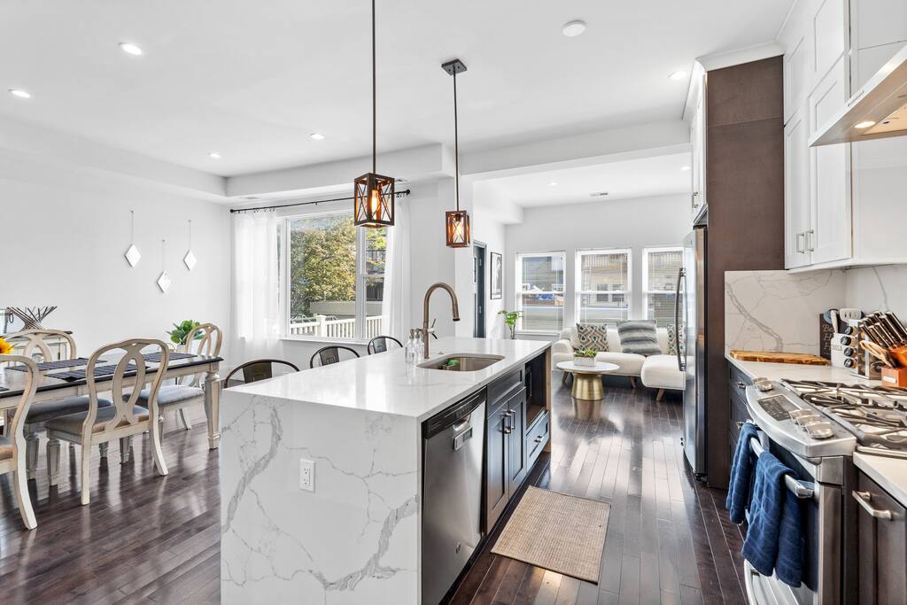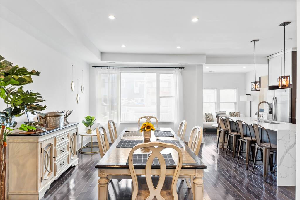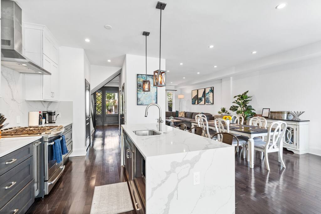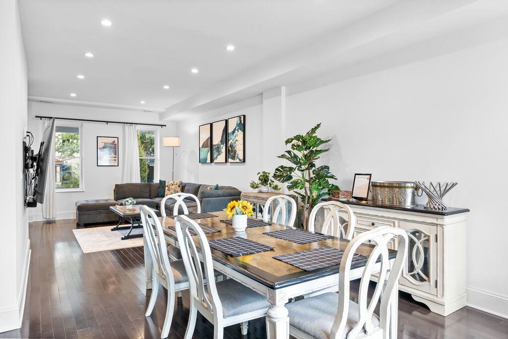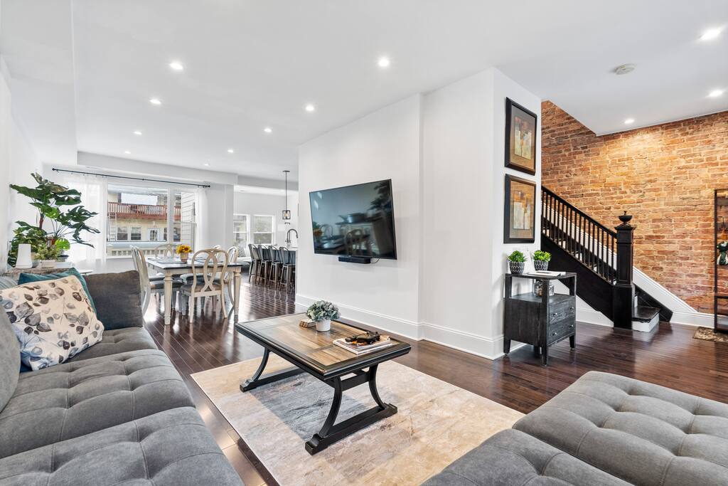 ★ TWO TOP-RATED DC AIRBNBS COMBINED ★ This unique 6-bedroom property joins two of DC’s highest-rated Airbnbs into one private full-home retreat—perfect for large families and groups. Enjoy two full kitchens, two living and dining areas, with front and back patios. ★ SPACIOUS + FLEXIBLE LAYOUT ★ Across FOUR levels, you’ll find 6 bedrooms and 4.5 baths with modern finishes, comfortable beds and dedicated workspaces. The design offers plenty of space for gathering together or spreading out for privacy. ★ HIGHLIGHTS ★ ✸ Two self-contained units with full kitchens & laundry in each ✸ Garage parking for 2 vehicles (fits large vehicles) ✸ Stylish interiors with CB2 furnishings and thoughtful amenities ✸ Family-friendly: board games, books, hotel-quality linens ✸ Walk to Metro, dining, and nightlife ★ PERFECT FOR GROUPS AND FAMILIES★ Whether hosting a reunion, milestone celebration, or extended family trip, this home combines the feel of a boutique hotel with the comfort and privacy of a residential stay.